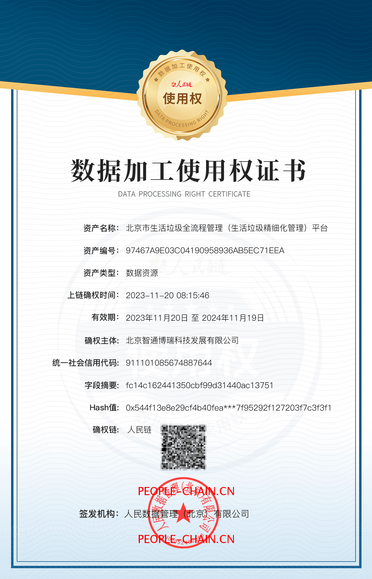 北京市生活垃圾全流程管理(生活垃圾精细化管理)平台 信息传输及信息技术服务数据加工使用权已确权