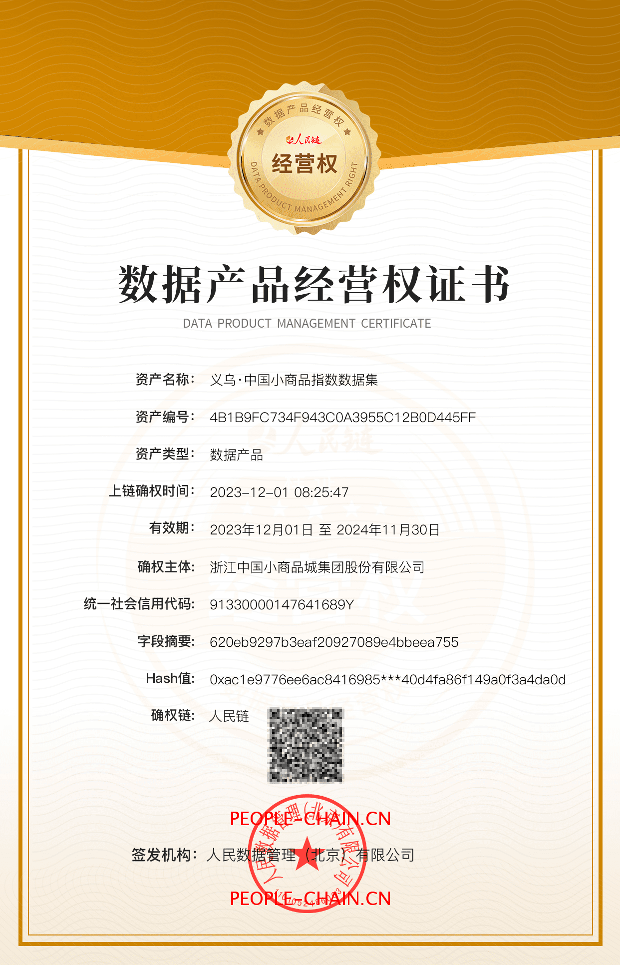 义乌·中国小商品指数 批发零售数据资源持有权+数据加工使用权已确权